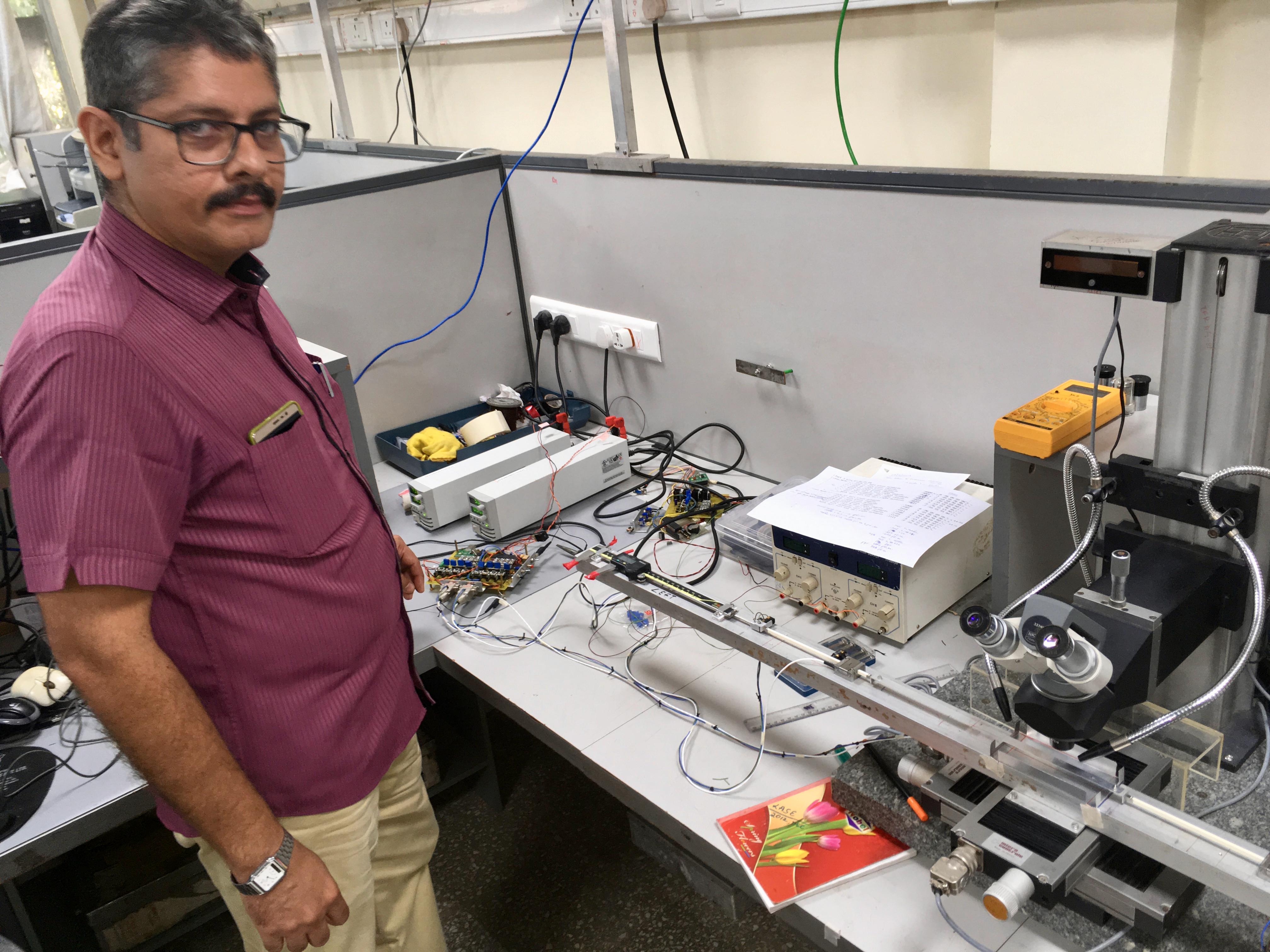 Pankaj Madhwani (Scientific Officer, Tata Institute for Fundamental Research) with prototype of piezo-electric driven slit for spectrograph.
