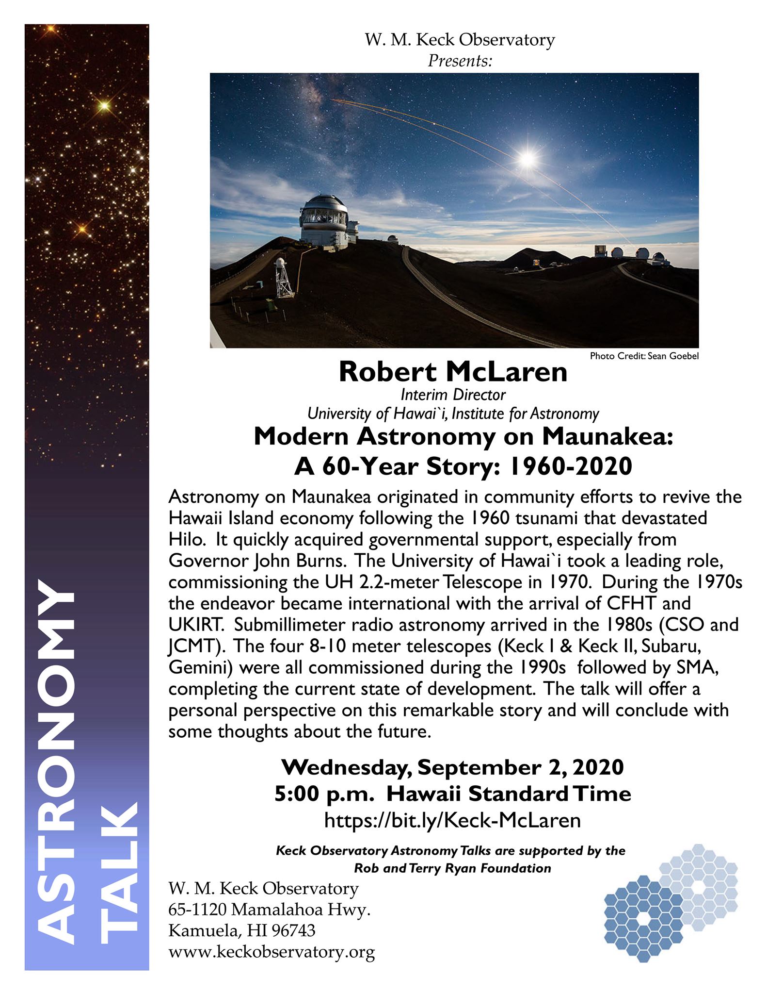 Robert McLaren, interim Director of UH Institute for Astronomy will present the 60-year history of modern astronomy on Maunakea from 1960 to the present.
