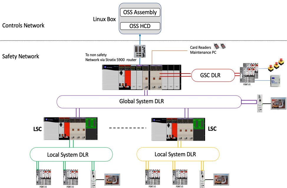 The Rockwell Allen-Bradley GuardLogix Programmable Automation Controller and associated safety rated input/output modules were chosen by TMT for the OSS design. These products provide a distributed programmable solution, which is a good fit for TMT, and utilize a separate safety network, over which the AB Rockwell CIP Safety network protocols are used.