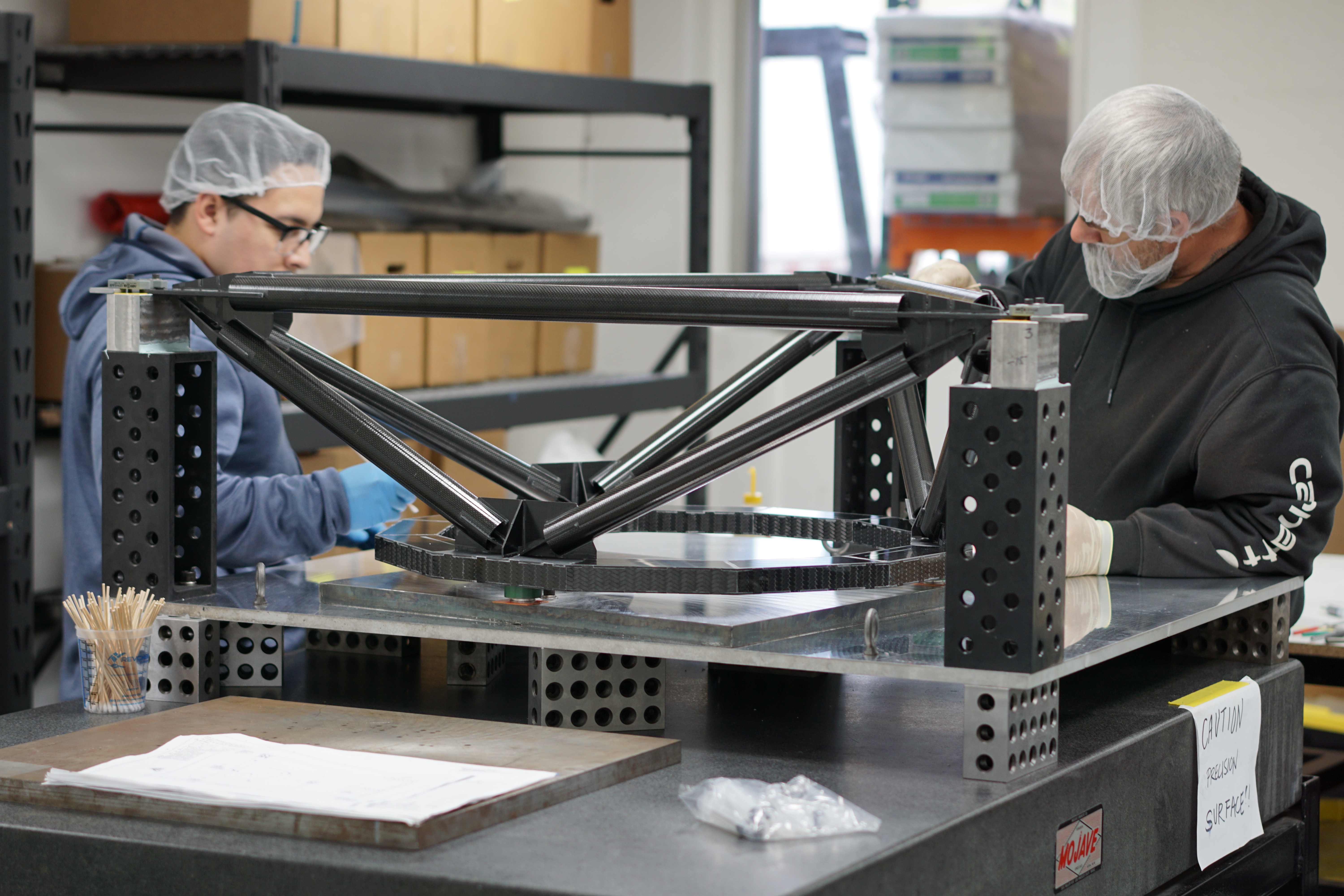 Production process of the first TMT carbon fiber metrology frame by Rock West Composites, February 2020 - Designed as a truss structure, the carbon fiber parts are assembled together and bonded in place. The metrology frame will be used to accurately position the M1 mirror segments during installation. - Image credit: Rock West Composites