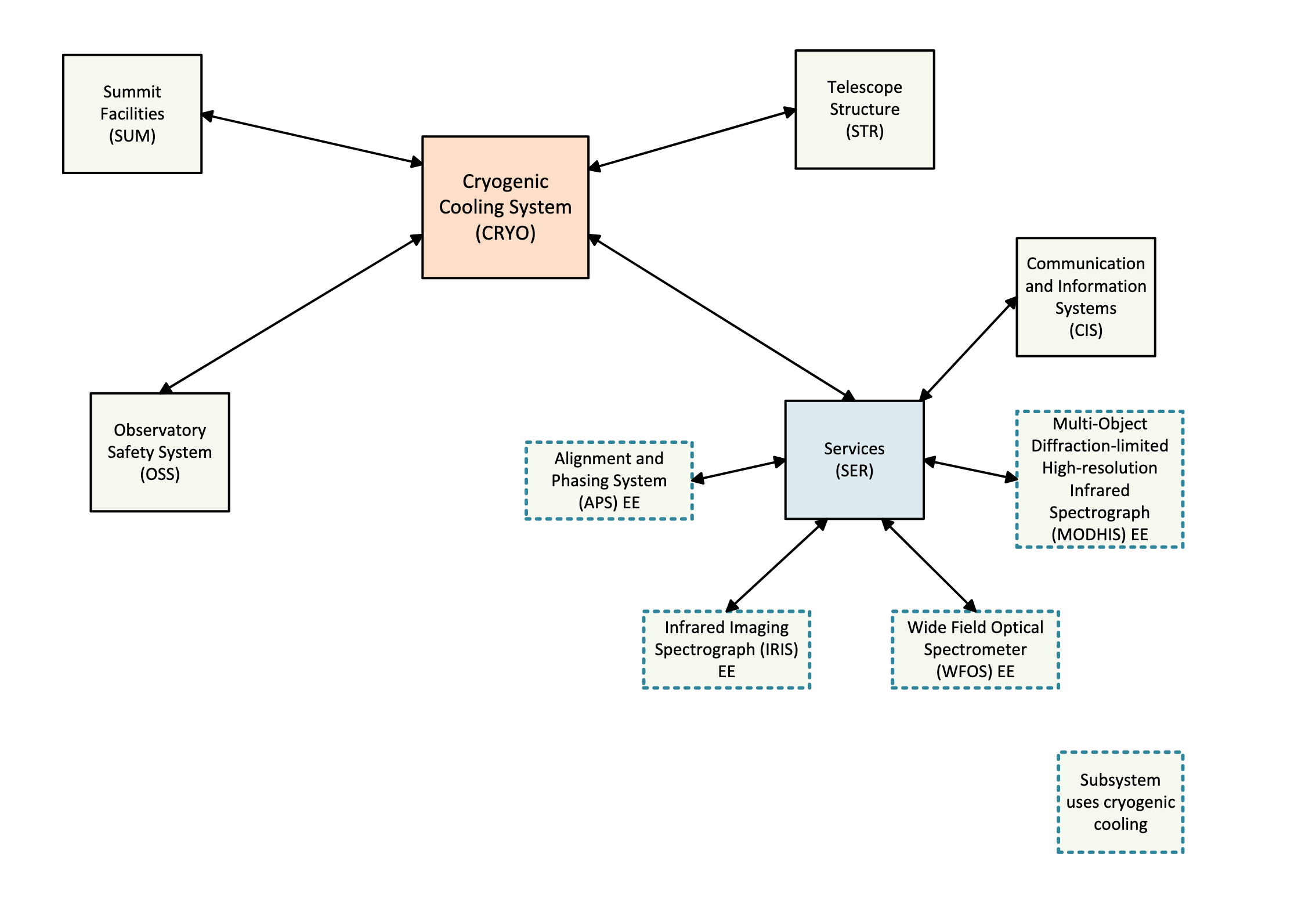 The sensitivity of TMT’s near-infrared instruments is strongly affected by ambient heat, which generates strong thermal background noise at these wavelengths. As such, it is necessary to keep critical optical elements within large vacuum chambers, or cryostats, and the CRYO system maintain all temperature sensitive elements at low temperature to reduce their infrared thermal signature. IRIS and MODHIS will have the ability to detect the near-infrared light of faint astronomical sources through the warm Earth atmosphere.TMT’s other first-light instrument, Wide Field Optical Spectrograph (WFOS), will operate at visible wavelengths but will still require its detectors to be cooled by CRYO. The figure below shows the interface between CRYO and first-light TMT subsystems.
