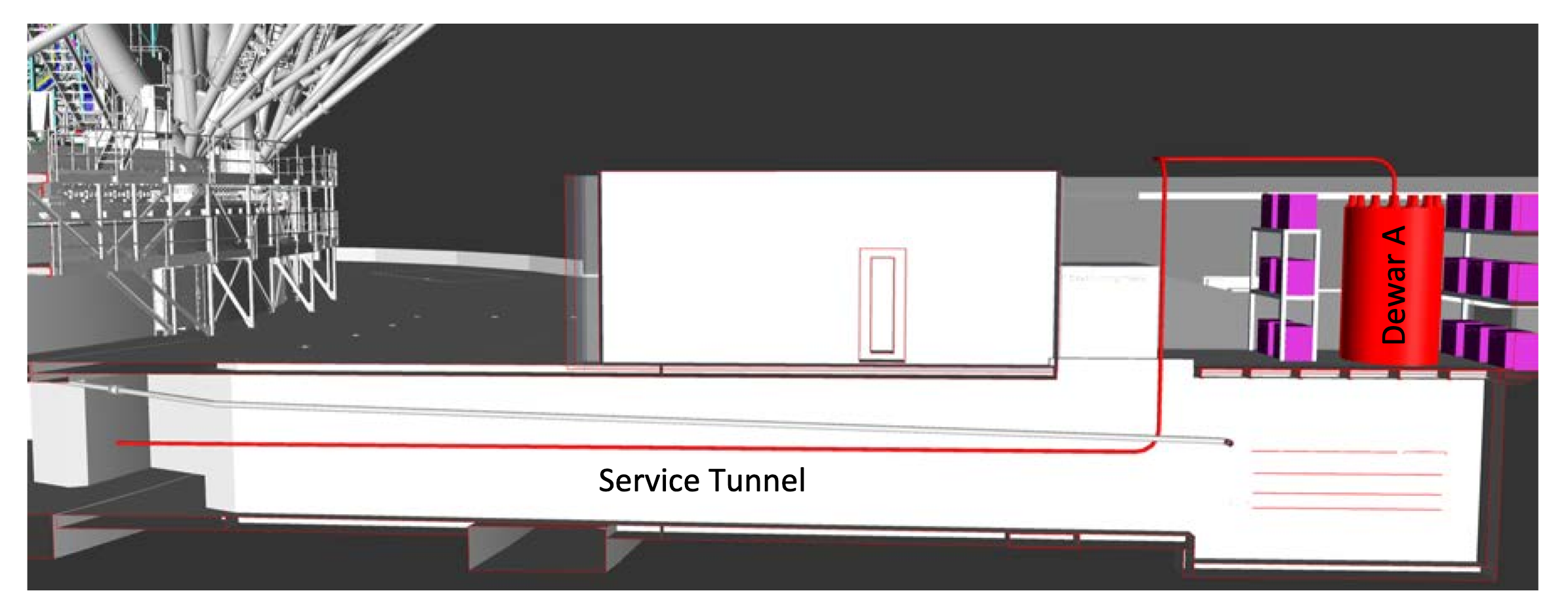 TMT’s Cryogenic Cooling System (CRYO) liquid Nitrogen (LN2) route along the Service Tunnel. The figure shows the LN2 route starting at Dewar A in the LN2 generation plant located at close proximity of the service tunnel, an underground structure designed to provide a passage for all services into the telescope - Image credit: TMT International Observatory