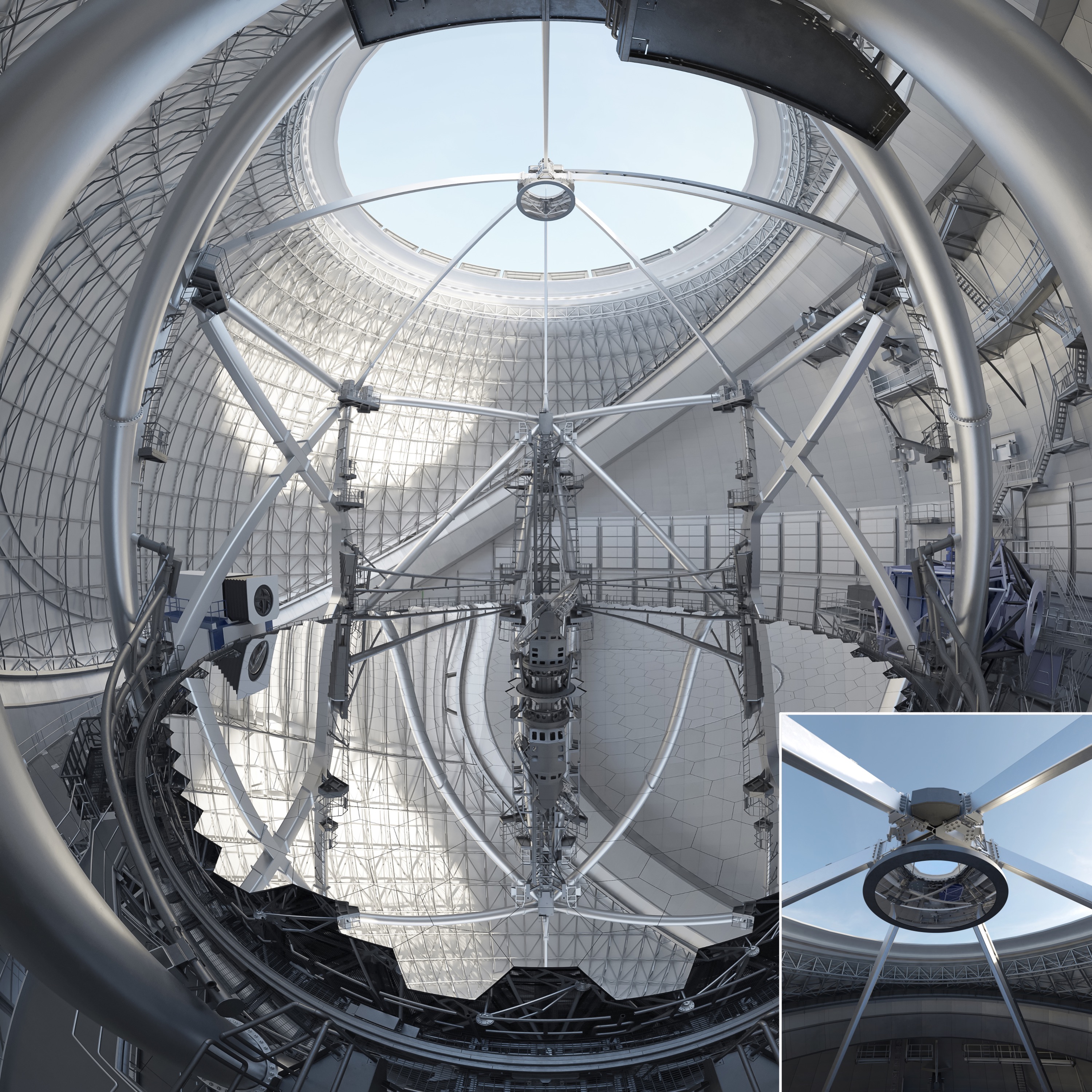 TMT’s secondary mirror system is viewed on top of the telescope structure, facing downward in the direction of the TMT tertiary mirror. The image inserted at the bottom right shows an artist impression of the M2 system. The purpose of the M2 system is to refocus the light beam in the direction of the plane tertiary mirror, where it is reflected toward the science instruments. Image credit: TMT International Observatory