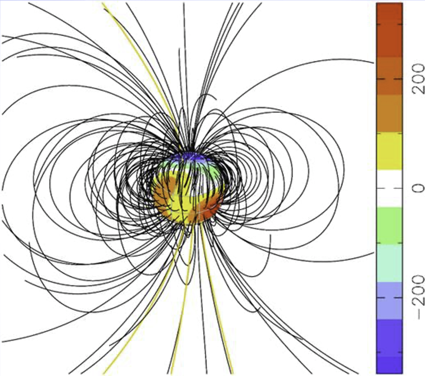 Potential polarimetric science cases for MODHIS. This figure shows the magnetic field around Proxima Cen using HARPS (Klein et al. 2021, MNRAS, 500, 1844) as an example of the work that could be done with MODHIS. Magnetic field structures can be mapped using the polarized light that probes spot geometries, and then correlated with potentially habitable planet locations. Image credit: TMT International Observatory