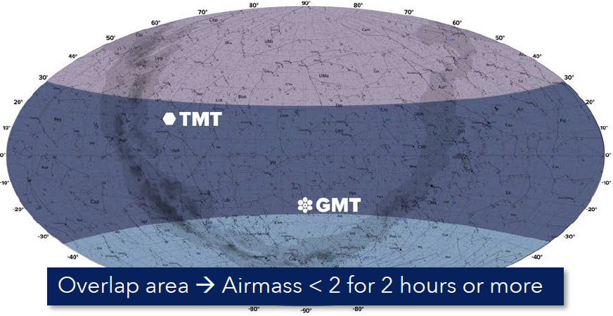 The combined apertures of TMT and Giant Magellan Telescope are comparable to that of the single European ELT, but for many scientific programs, access to two telescopes and a diverse instrument suite offers clear advantages. All-sky coverage enables observation of relatively rare phenomena (e.g., the number of observable rocky planets in the habitable zone is predicted to be small), unique targets in each hemisphere (e.g., Magellanic Clouds in the Southern Hemisphere, Andromeda group galaxies in the North), and key survey fields with unique multiwavelength data sets (e.g., GOODS-North and -South; LSST Deep Drilling fields; the Kepler main survey field; ecliptic pole deep survey regions for TESS, Euclid, WFIRST and JWST).