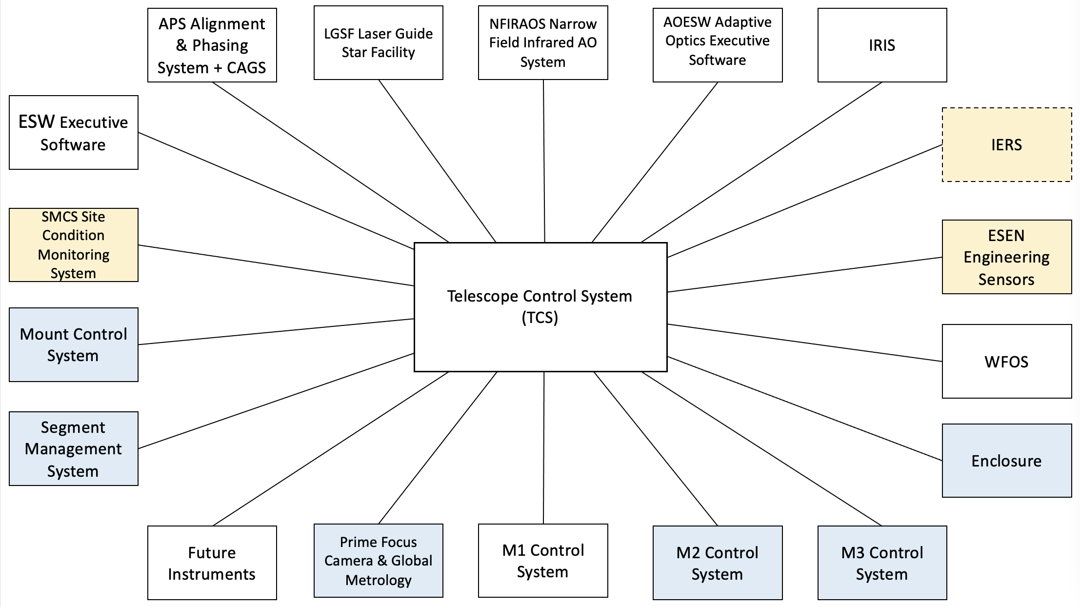 The Telescope Control System (TCS) is a Supervisory Coordination System and contains the Pointing Kernel. The TCS is linked to the Adaptive Optics System(s), Laser Guide Star Facility, science instruments including the on-instrument wavefront sensors and the Alignment and Phasing System.