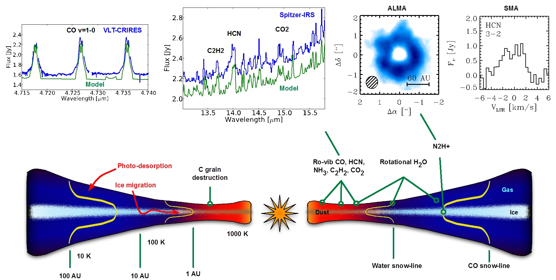 Sketch of different probes of molecules in disks. The mid-infrared predominantly traces the inner few AU, corresponding to the terrestrial planet-forming region.