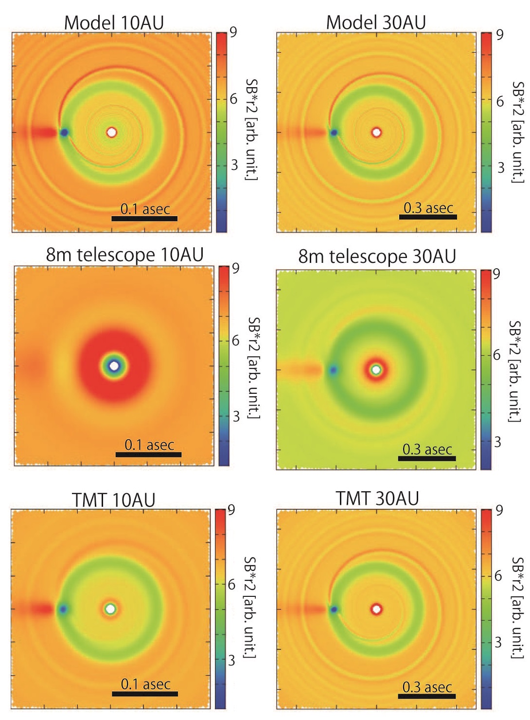 Model images in H band for gaps and spirals in a disk caused by a 0.1 MJup planet around a solar-mass star, obtained with 2D hydro-dynamical simulations. Disk aspect ratio of 0.05, and local isothermal, hydrostatic balance was assumed for the vertical structure. The color scale denotes surface brightness multiplied by r2 (r is distance from central star). Top: The models at the raw resolution with a planet at r = 10 AU (left) and r = 30 AU (right). Middle: Images expected with an 8 m telescope. Bottom: Images expected with TMT, models were convolved with Gaussian functions of diffraction-limited FWHMs assuming a distance of 140 pc. Dark spots are "planet shadows", indicating the location of the planet (Jang-Condell 2009). Note: 3D thermal balance calculations are necessary to predict planet shadows; the sizes of dark spots are tentative in these images.