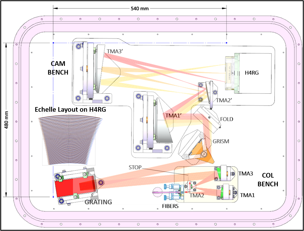 High dispersion, i.e. R ≃ 100,000 is provided by a red/blue two arm Echelle type design (Fig. 3). The diffraction-limited input greatly simplifies the design and procurement of dispersive elements. Our design fits in a small suitcase (Fig. 4), and uses gratings available off-the-shelf. At the core of each spectrograph arm is a H4RG detector, whose large format is sufficient to satisfy our wavelength coverage and multiplexing requirements.