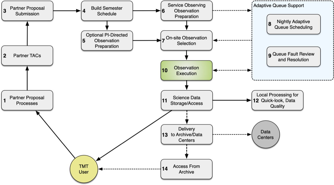 A significant result of the TMT Operations Plan is agreement and definition of the operations modes that TMT will support and a workflow that describes the steps that occur when observing with TMT from an astronomer/TMT science user’s point of view. This is important for the TMT Software System and SOSS, because the software system design must demonstrate that it supports the operations modes and the end-to-end observing workflow. The workflow is shown below. Each rounded rectangle represents a step in the workflow from the perspective of a TMT user. Arrows show how the workflow progresses. Each rounded rectangle contains a number that is used to identify the step in the following discussion. All steps other than step 10, Observation Execution, do not directly involve the telescope itself.