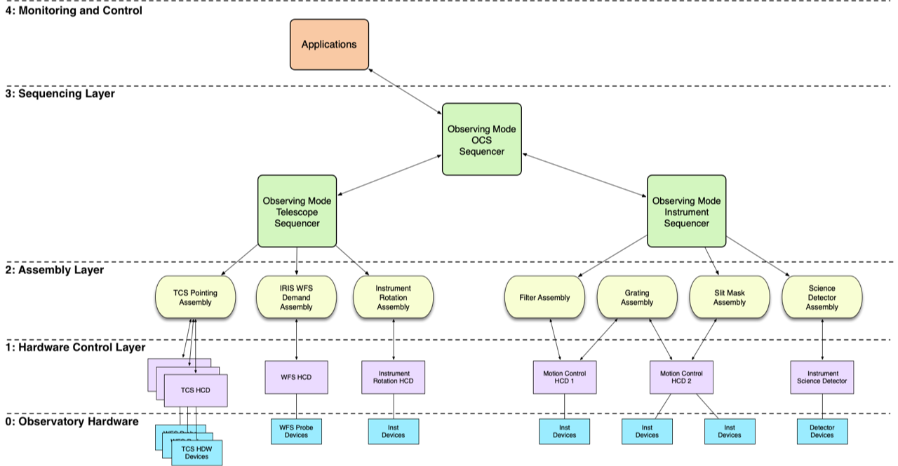 ESW sequencing builds on CSW-defined components including the Sequencer, which is one of the Observing Mode Oriented Architecture components along with HCD, Assembly, Container, Service and Application. The Sequencer is programmable by running a “script” that can vary based on the observing mode in use. Scripts are stored in the ESW script repository. The Sequencer executes the Sequence by examining and processing each step of the Sequence and taking any actions needed to match the step such as sending commands to other components. For most observations (i.e. science, calibration, engineering) a master OCS sequencer exists that controls other subsystem sequencers (such as TCS and IRIS) that control Assemblies in each subsystem.