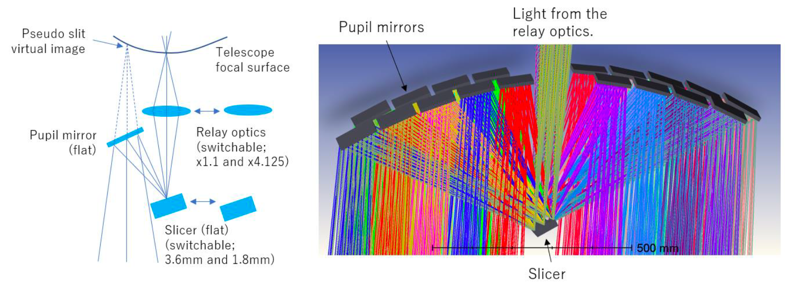 The table below shows current parameters of the IFU. In the current concept, the IFU has two relay optics with different magnification factors and two slicers with different slice widths, and these slicers and relay optics are separately switchable. Their combination provides four different field-of-view (FOV) options with different slice widths on sky.